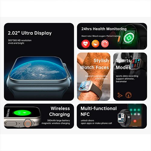 The T800 Ultra Smartwatch – Ultra Series 8 is built for both fitness enthusiasts and tech-savvy users. Equipped with NFC for payments, Bluetooth calling, and wireless charging, it ensures convenience on the go. The watch offers comprehensive health tracking, including heart rate monitoring, sleep analysis, and multi-sport activity tracking. Its waterproof design and durable construction make it suitable for outdoor activities, workouts, and daily wear. With a bright AMOLED display and a stylish orange strap, this smartwatch blends functionality with modern aesthetics.