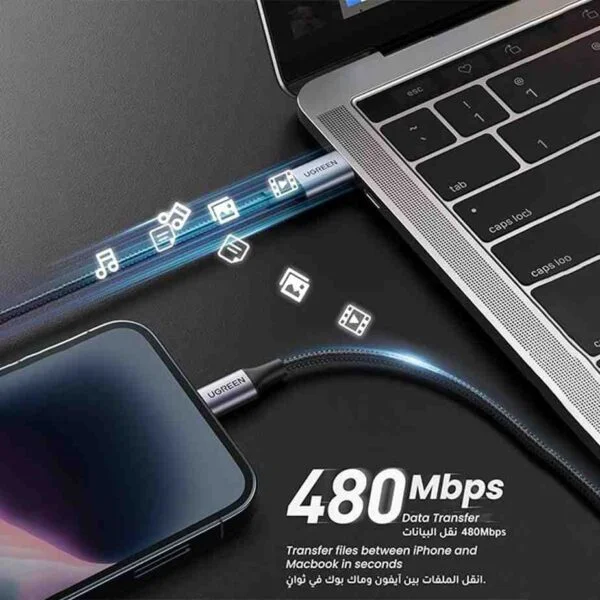 The UGREEN 2 M Lightning Cable (USB-A to Lightning) is an MFi-certified, high-durability charging and data cable designed for iPhone (6–14 series) and iPad devices with Lightning ports. It supports up to 2.4 A charging current, offers a 480 Mbps data transfer rate, and features robust build materials for long-lasting use.