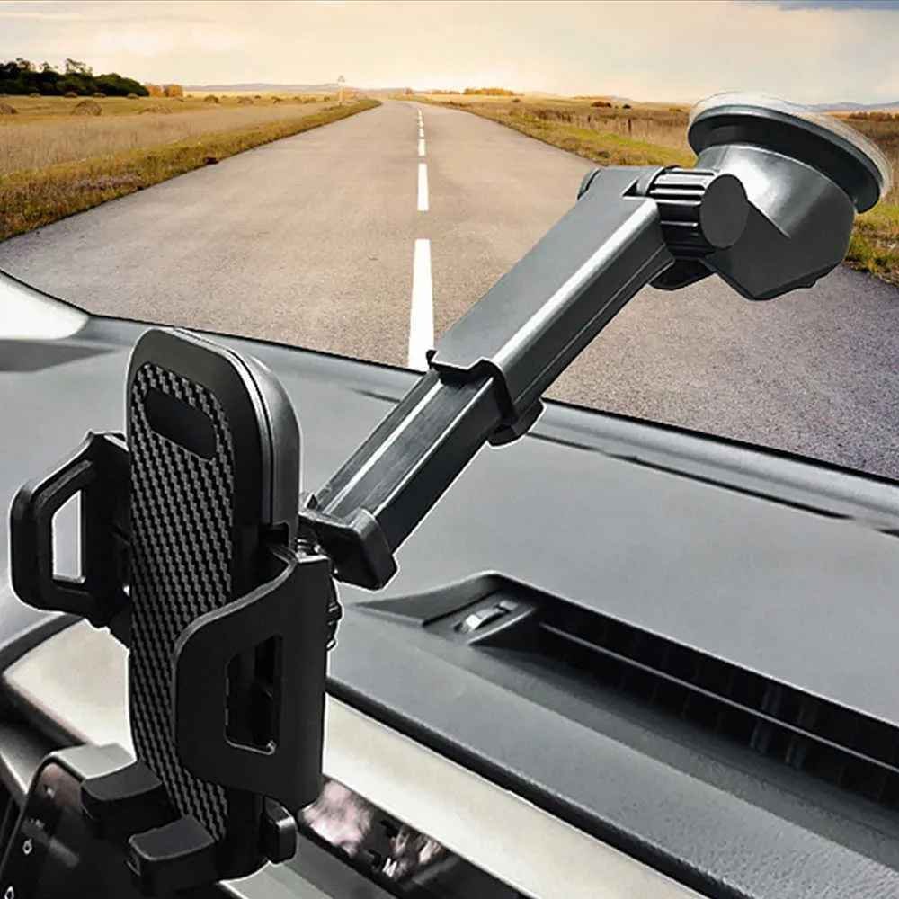 A versatile and sturdy mobile phone holder for cars. Features a long adjustable arm, heat-resistant strong suction cup, and universal compatibility for all smartphones. Perfect for navigation, hands-free calls, and safe driving.